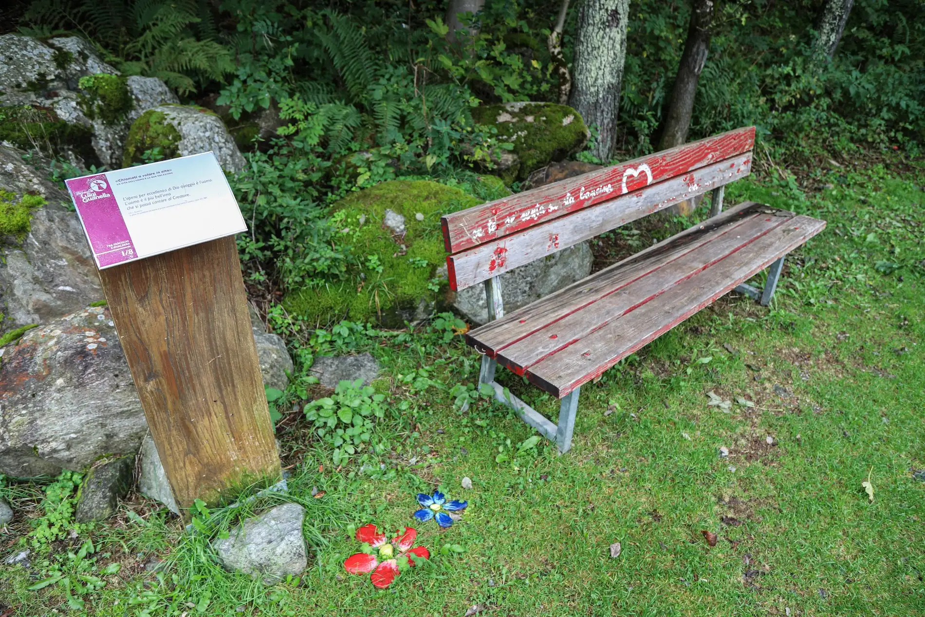 L’8 aprile 1852, a Luigi Guanella pareva «che il giorno della prima Comunione l’avrebbe passato meglio nella solitudine di Gualdera (la stagione era primaverile). In questo alpeggio, presso la cascina paterna, si solleva un piccolo colle detto Motto, sostenuto a mezzodì da uno scoglio, quasi muraglia […]. A metà dello scoglio sono due piccoli prati a forma di divano. […] Quel giorno egli si adagiò nel primo divano, deciso a rimanervi a lungo in preghiera ed in lettura. Intanto nel suo cuore si svolgeva un paesaggio di soave dolcezza quasi di paradiso che lo persuadeva a forti propositi di bene. Durò per pochi minuti, ma gli lasciò, fino ai suoi settant’anni, un soave conforto ed un ricordo che vorrebbe pur perpetuare nella pietra» (L. Guanella, Le vie della Provvidenza, 1913-1914).